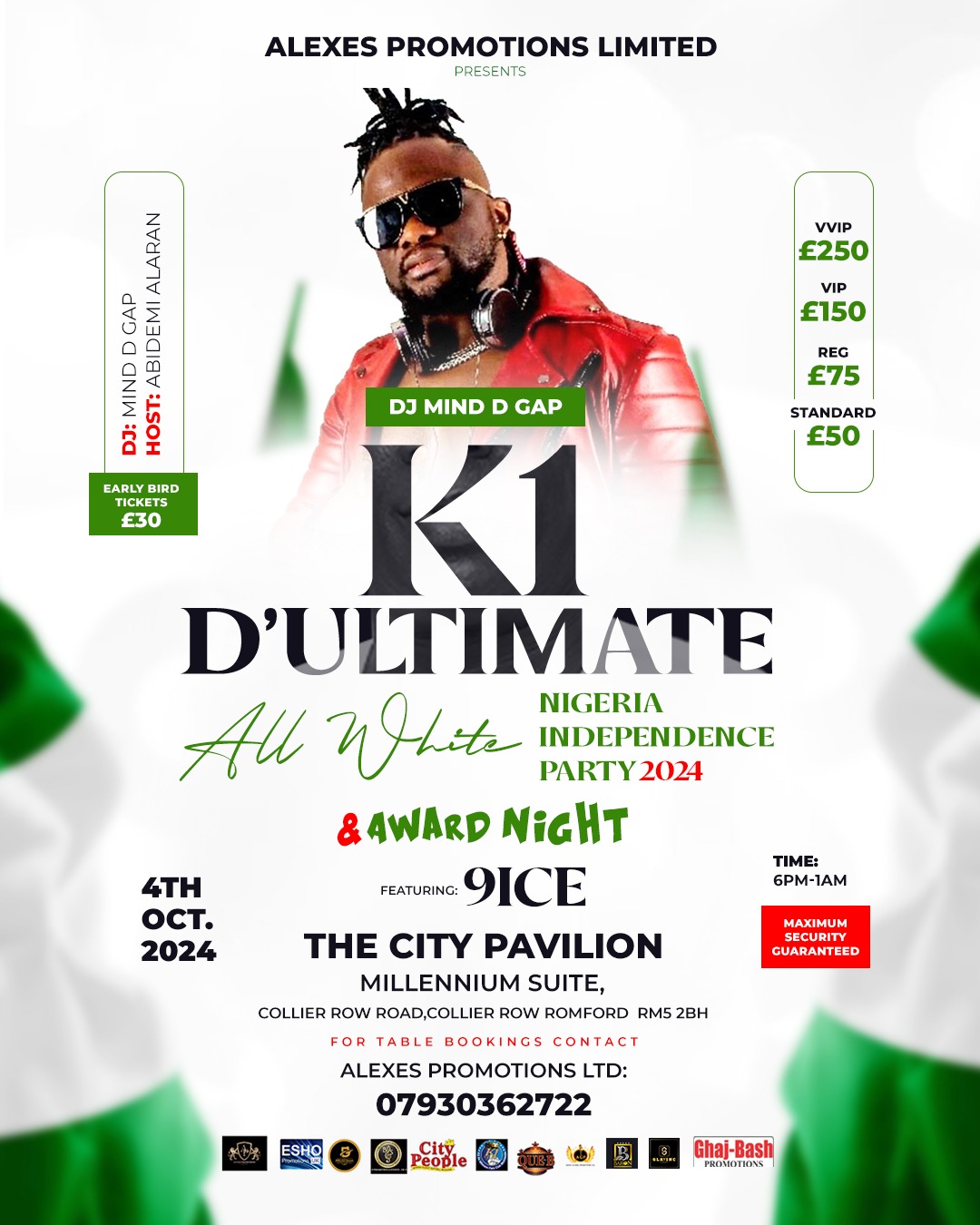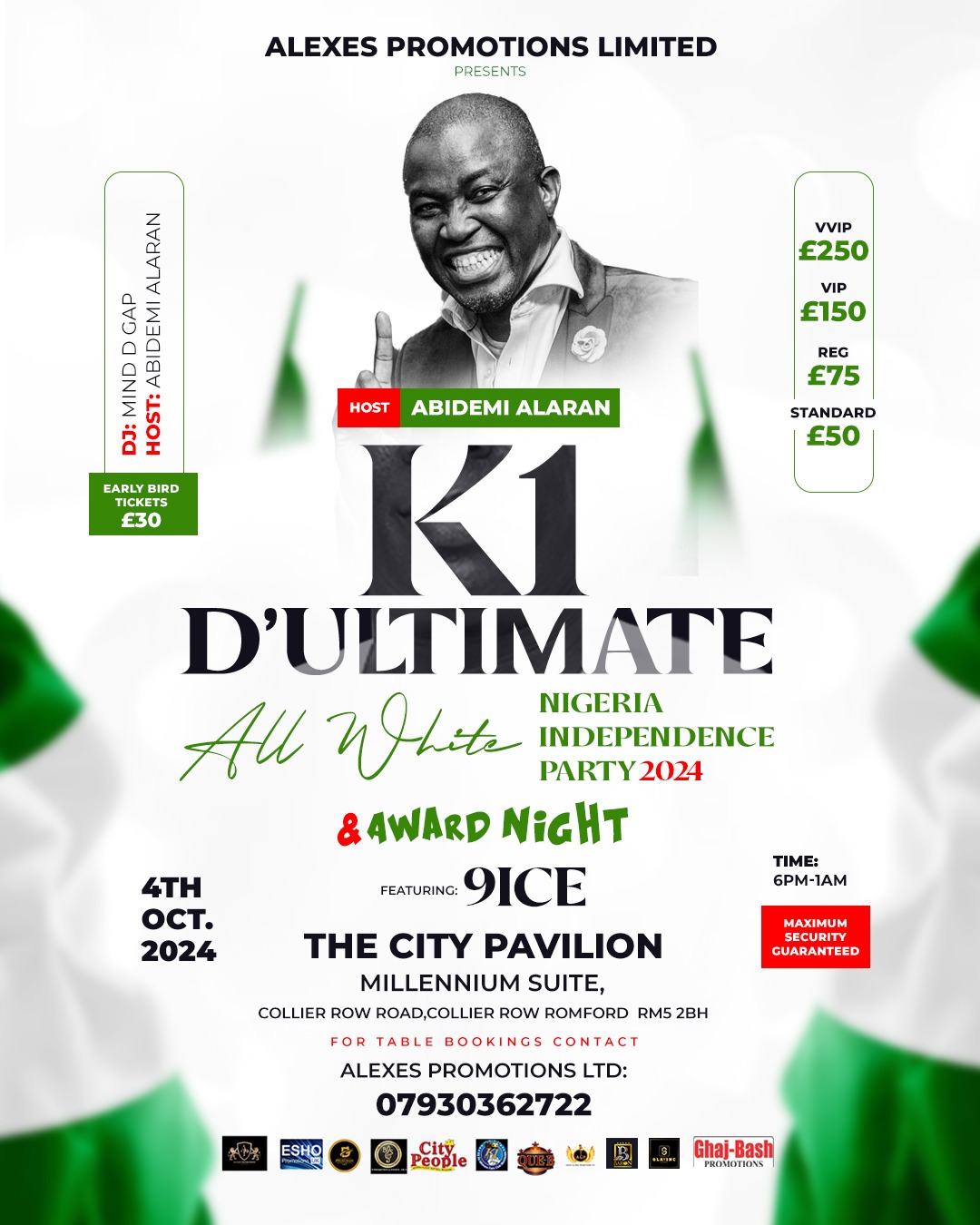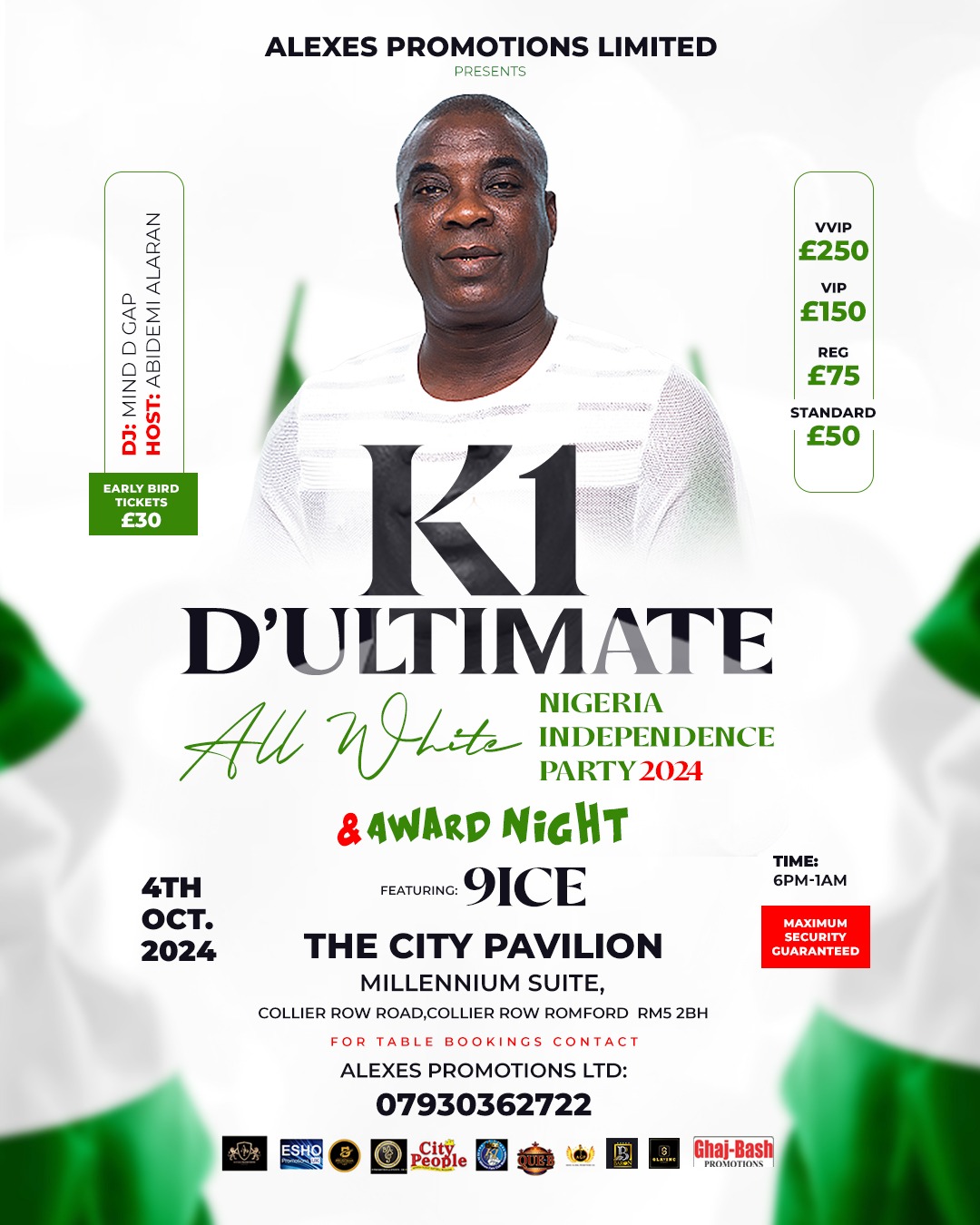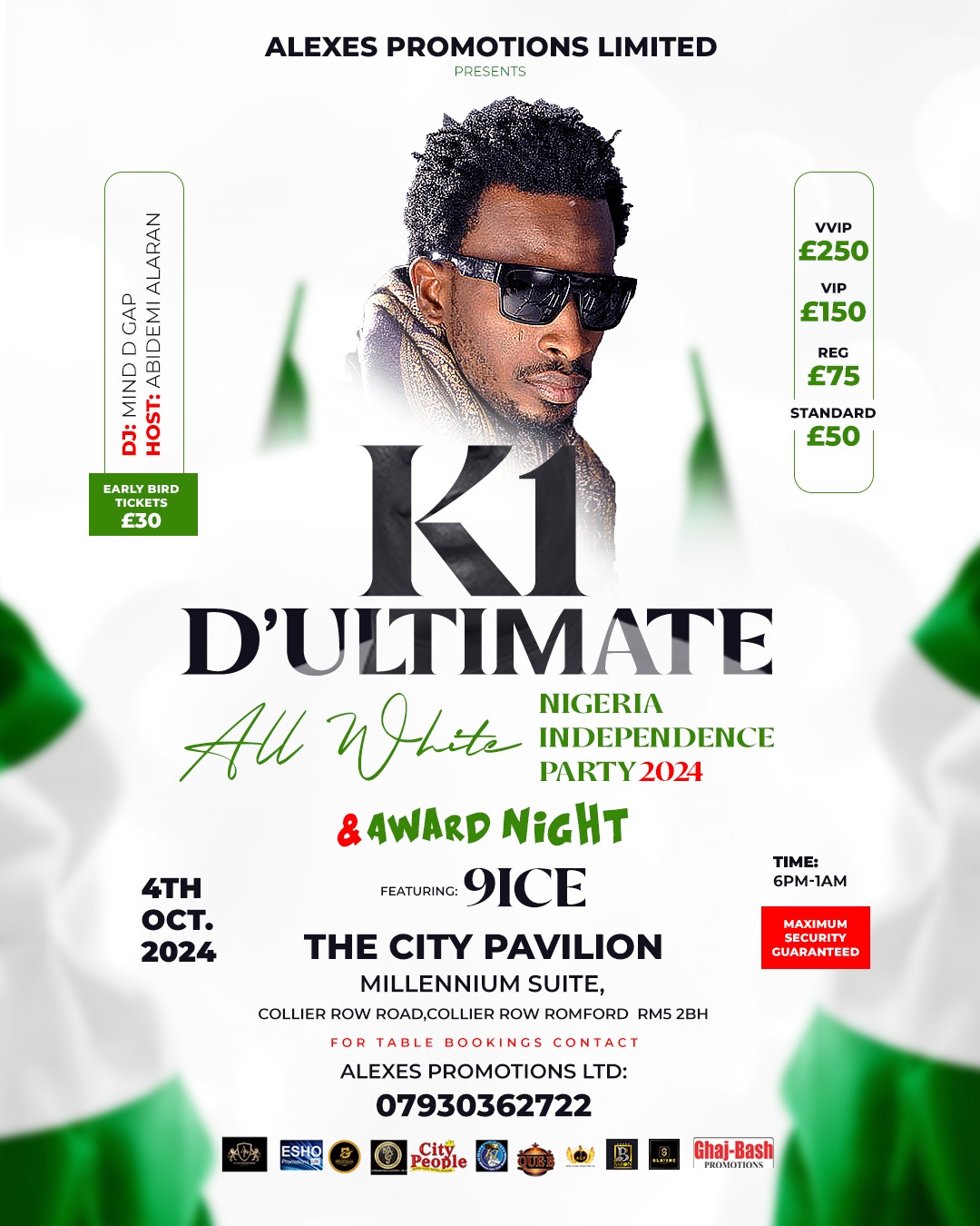 ALL WHITE NIGERIA INDEPENDENCE PARTY 2024 0 By GlmagAdmin on September 25, 2024 Events, London Events Description K1 D’ULTIMATE ALL WHITE NIGERIA INDEPENDENCE PARTY 2024 FEATURING 9NICE ALAPOMEJI click here for tickets