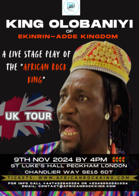 Come join us for an electrifying evening filled with music, drama, and culture at St Luke’s Hall Peckham, London, United Kingdom, for a live stage play of King Olobaniyi: The African Rock King.